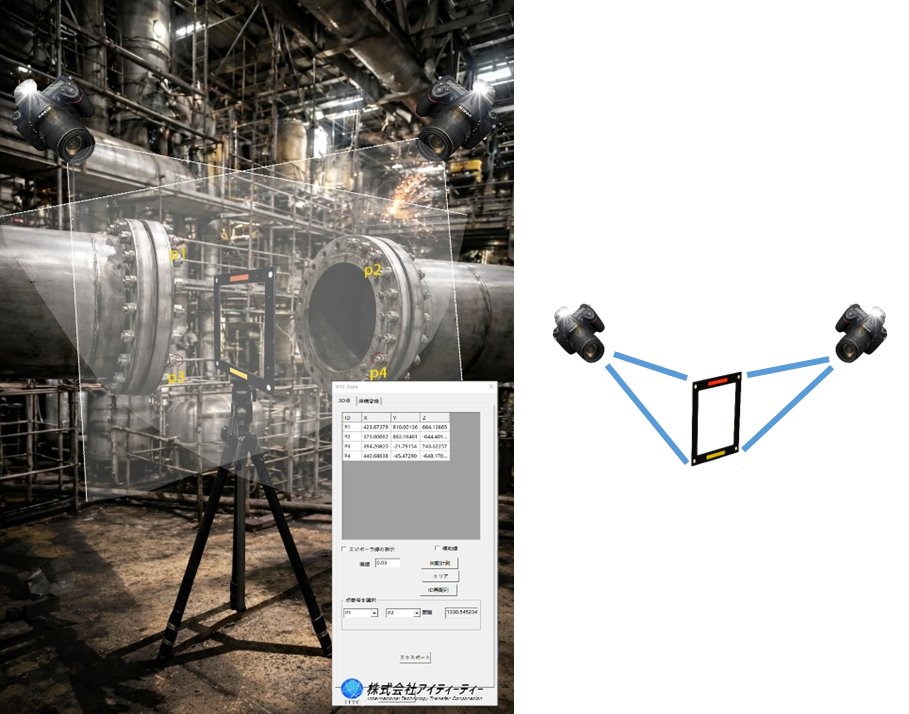 PhotoCalc TwoView画像計測ソフトは、2画像をもとに測定対象の3D位置の計算を行います。